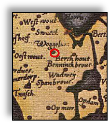 A portion of a 1583 navigation chart by Lucas Jansz Aurigarius shows Woggelum northwest of Hoorn. North is at the left.4