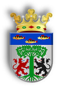 On a silver background, a green lime tree, held on the right by a red lion with nails and tongue of azure, on the left by a sable lion with nails and tongue of red; in a shield head of azure 3 gold bass with stripes of sable, gilled, tailed and finned in red, placed 2 and 1. The shield covered with a golden crown with 3 leaves and 2 pearls.